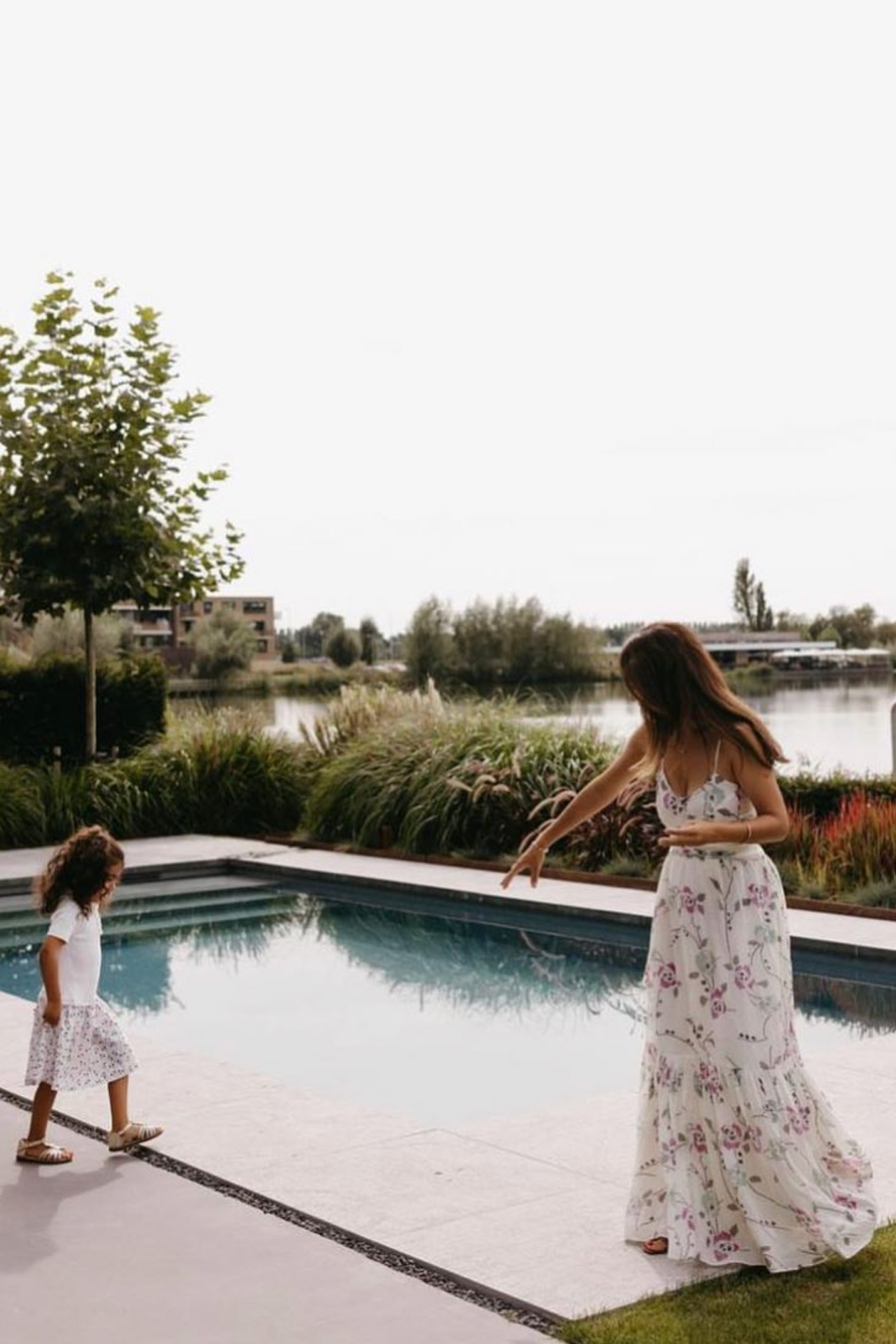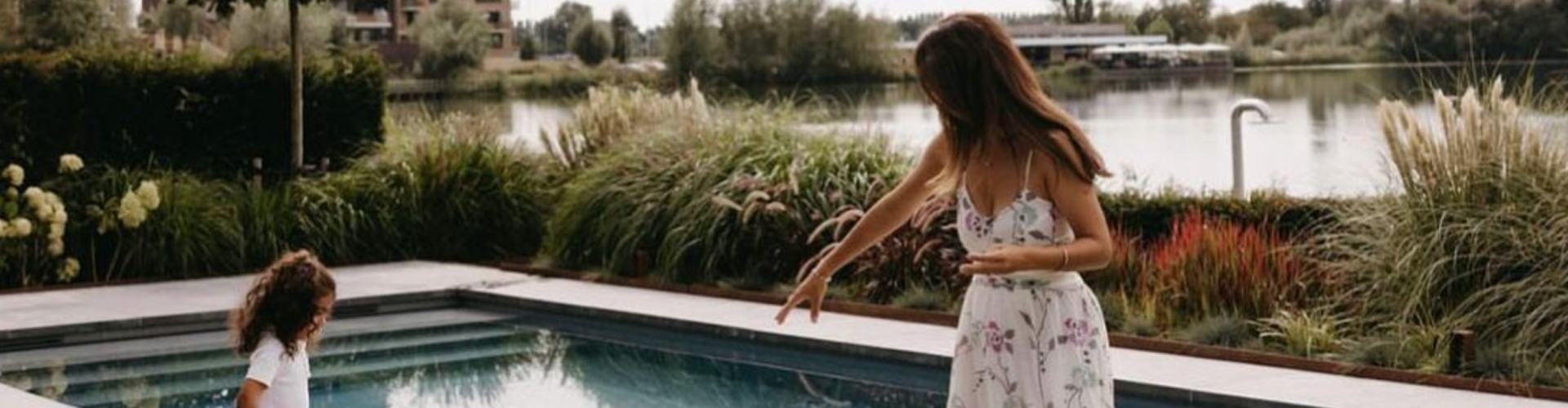 Terwijl de kleine Olivia met haar speelgoedpoppetjes aanschuift aan tafel, vertelt Wendy verder: “Mo heeft het ondernemersbloed echt van huis uit meegekregen. Zijn vader startte destijds een van de eerste Arabische supermarkten, later begon hij een groothandel in lampen. Mo heeft daar nog gewerkt, maar begon uiteindelijk ook zijn eigen onderneming. Nu is hij directeur-eigenaar van een vleesbedrijf. Ik heb zelf een aantal jaren als moderedacteur gewerkt. Toen we kinderen kregen ben ik daarmee gestopt, omdat ik me meer op de kinderen wilde richten. We woonden inmiddels samen in Arnhem, maar waren op zoek naar een groter huis. We vielen als een blok voor deze villa en de unieke ligging aan het water. We bedachten vrij snel dat het wel een leuk idee zou zijn om een zwembad in de tuin te laten bouwen. Er was ruimte genoeg voor. De vorige eigenaar, met wie we goed contact hadden, vertelde ons dat hij daar ook al plannen voor had gehad. Hij had al ooit contact gehad met Roy Dieker van Hybrid Pools. Hij vertelde ook over een zwembad met een terrasafdekking erop. Dat leek ons ook wel wat, dus we namen contact op met Hybrid Pools.”